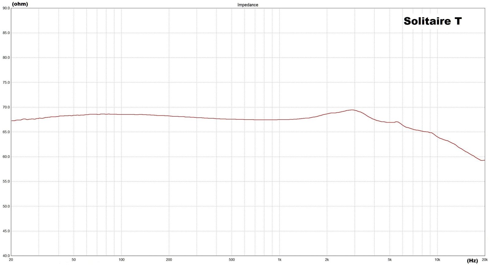 Oma laitteistoni mittaa Solitaire T:n impedanssin lähemmäs 68 ohmia, mutta se on silti lähellä valmistajan ilmoittamaa 64 ohmia. Ainoana epätasaisuutena impedanssi laskee jonkin verran ylintä diskanttia kohti, mutta alle 10 ohmin pudotuksella ei pitäisi olla käytännön vaikutusta sopiviin laitevalintoihin. Todella korkean lähtöimpedanssin omaavalla vahvistimella diskantin määrä saattaisi tippua aavistuksen verran, mutta samalla elementtien vaimennuskerroin laskisi joka tapauksessa siinä määrin, että se saattaisi lopulta vaikuttaa äänenlaatuun enemmän.