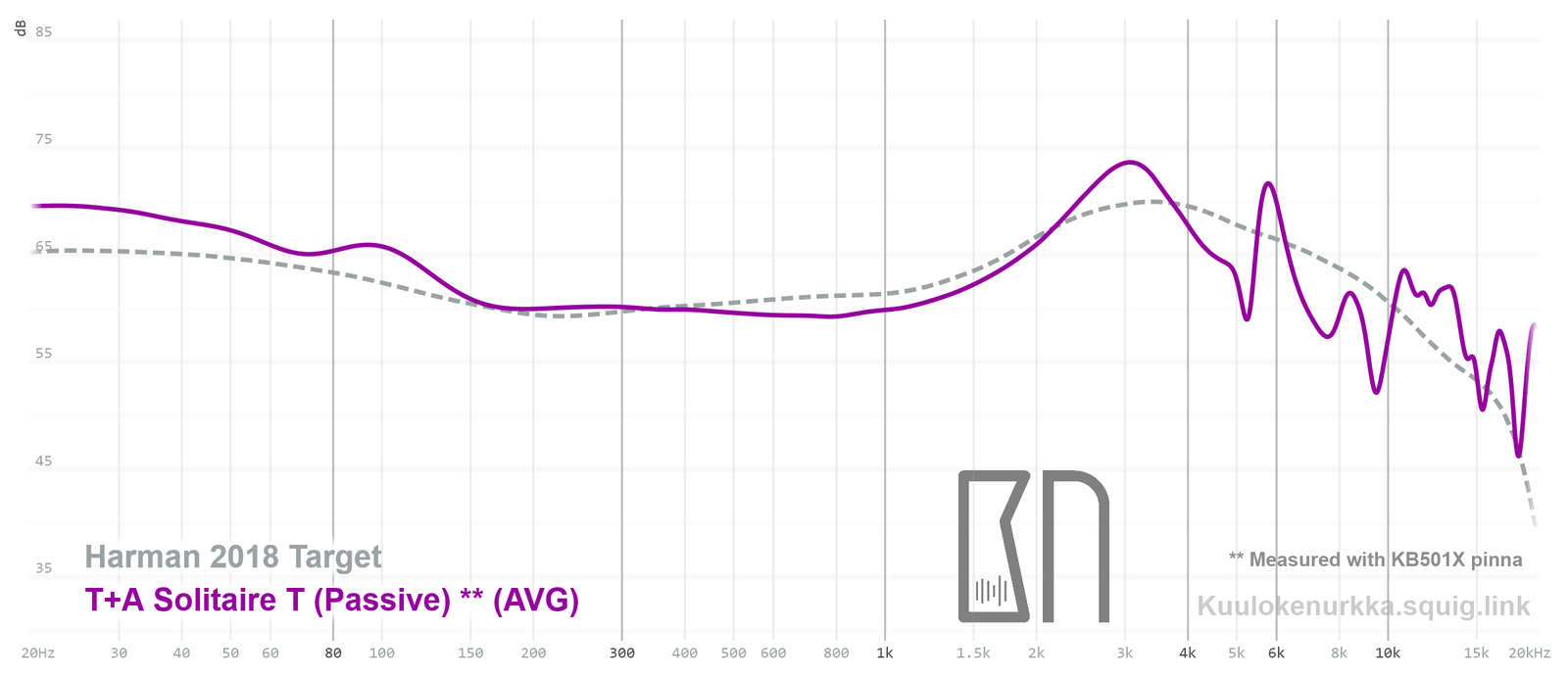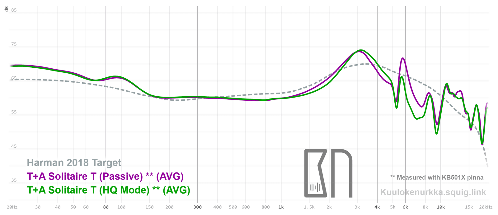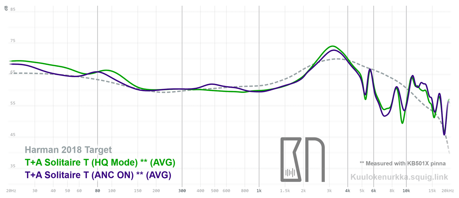 Our frequency response measurements have been made with a clone IEC-60318-4 coupler and KB501X pinnae. The Harman target curve from 2018 is used as a reference point and generalization of the headphone response that would sound good to most people. For more information on the measurements and their accuracy, see Headphone Measurements-sivulta. Solitaire T:n taajuusvaste on myös vertailtavissa muiden mitattujen kuulokkeiden kanssa Squiglink avulla.