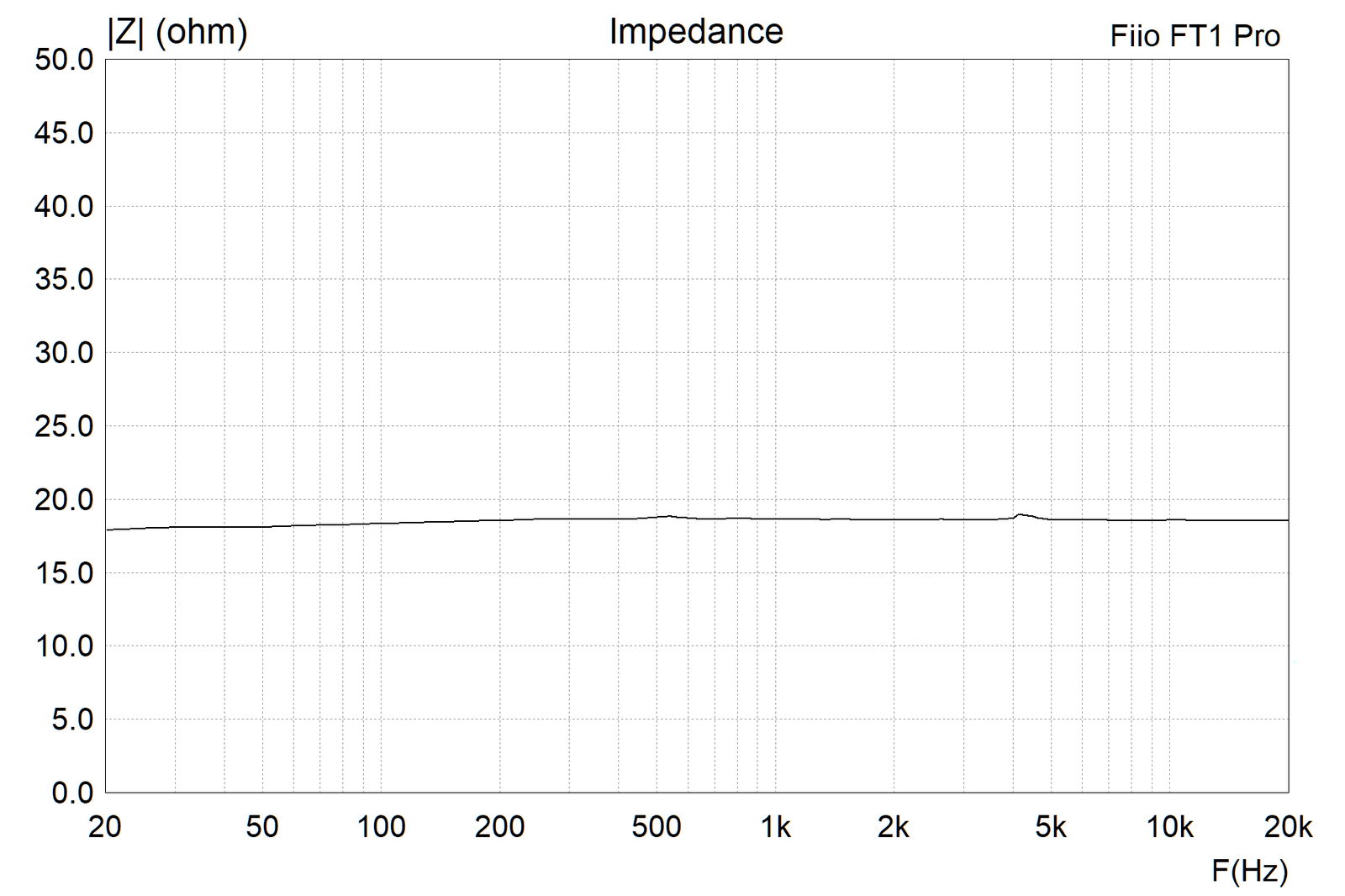 FT1 Pro:n impedanssikäyrä on useimpien planaarikuulokkeiden tapaan lineaarinen eli vahvistimen lähtöimpedanssilla ei ole minkäänlaista vaikutusta toteutuvaan taajuusvasteeseen. FiiO itse ilmoittaa kuulokkeidensa nimellisimpedanssiksi 20 ohmia, mutta omien mittausteni perusteella se on jopa aavistuksen matalampi 18,5 ohmia. Kuulokkeet tarvitsevat siis vahvistimelta hyvää virranantokykyä. Hieman tavallista pienempi herkkyys (95 dB/mW) huomioituna FT1 Pro:n vahvistaminen puhtaasti voikin osoittautua haasteelliseksi joillekin pienikokoisille mobiililaitteille ja muille dongle-tyyppisille vahvistimille. Mistään hankalasti vahvistettavasta tuotteesta ei silti ole kyse, kunhan vahvistin on suunniteltu toimimaan 10–20 ohmin kuormalla.