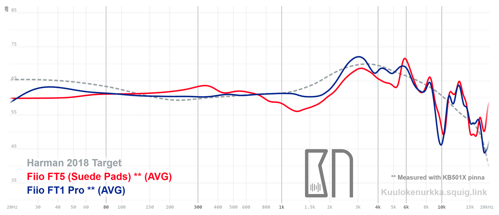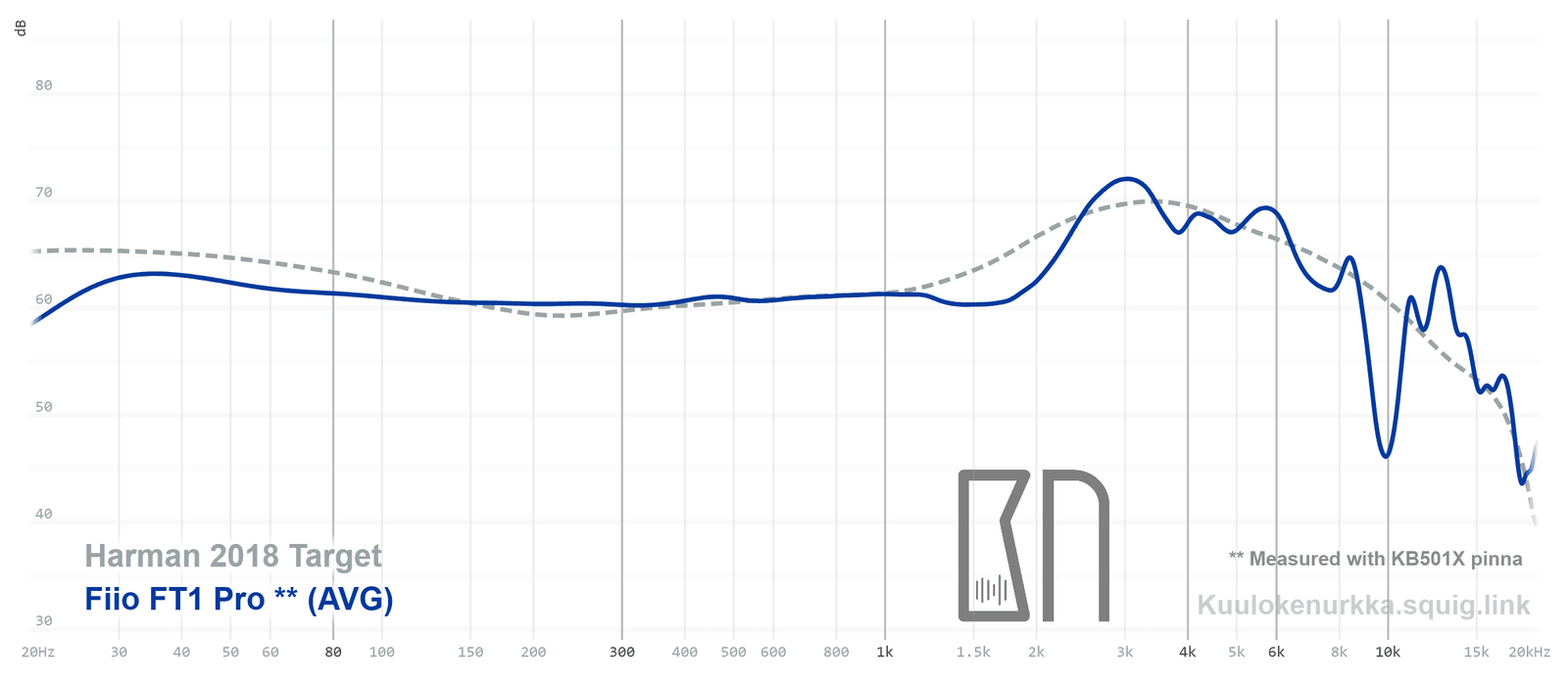Our frequency response measurements have been made with a clone IEC-60318-4 coupler and KB501X pinnae. The Harman target curve from 2018 is used as a reference point and generalization of the headphone response that would sound good to most people. For more information on the measurements and their accuracy, see Headphone Measurements-sivulta. FT1 Pro:n taajuusvaste on myös vertailtavissa muiden mitattujen kuulokkeiden kanssa Squiglink avulla.