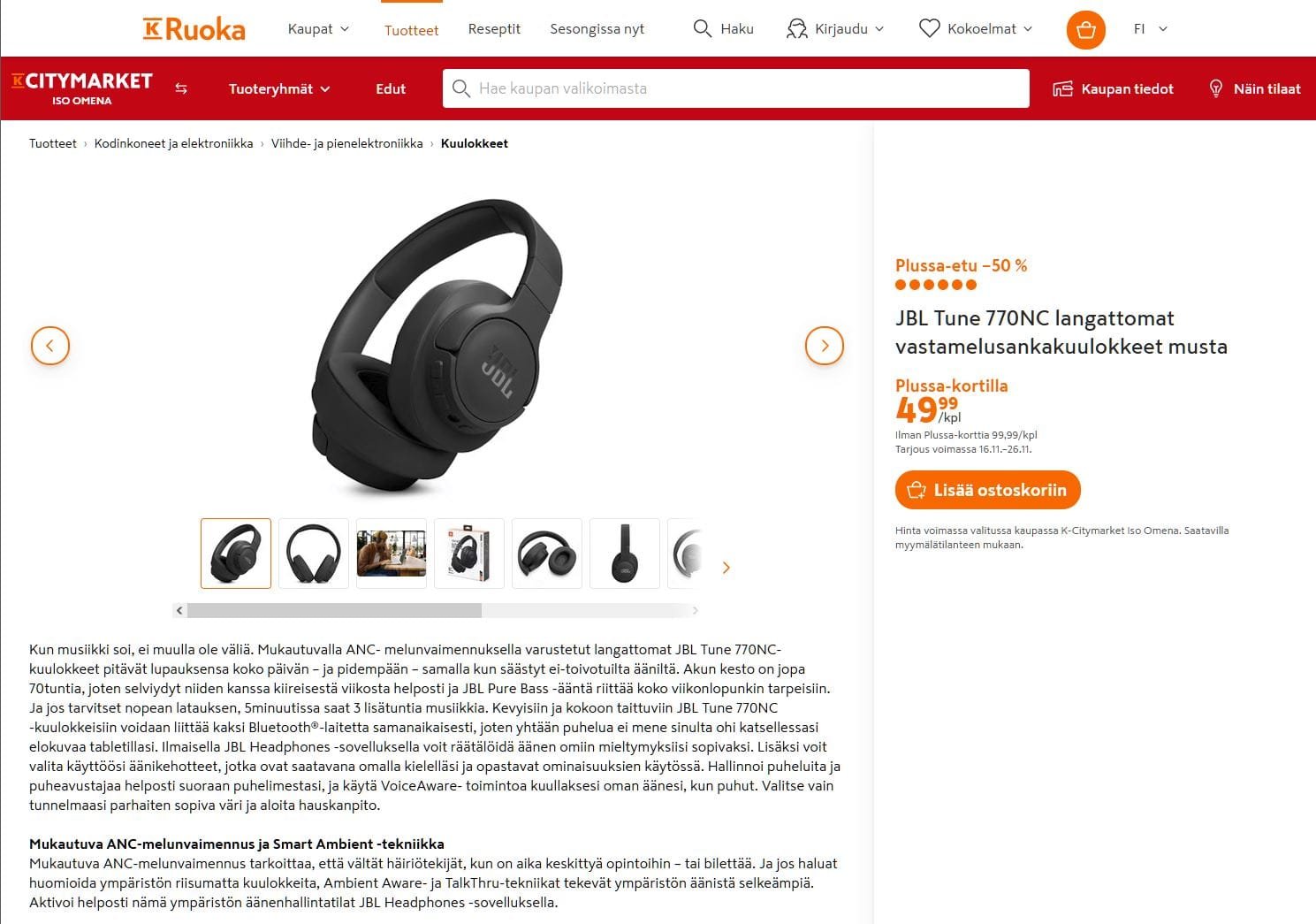 Loppuvuonna 2023 julkaistulle 770NC:lle annettiin suositushinnaksi 130 euroa, mutta todellinen markkinahinta putosi edeltävien mallien tapaan välittömästi 70-80 euron välille. Edellisen Black Fridayn aikaan kuulokkeet maksoivat edullisimmillaan 50 euroa ja Telia jakoi niitä myös ilmaiseksi puhelinliittymiensä mukana. Jos joku kaipaa edullisia vastamelukuulokkeita, Tune 770NC olisikin edullinen ja helposti hankittava vaihtoehto. Valmistaja myy myös hyvin vastaavaa Tune 760NC-mallia 10 euroa halvemmalla. Siitä vaikuttaisi puuttuvan läpikuuluvuustila ja akunkestokin on hieman heikompi Tune 770NC:hen verrattuna. JBL:n tuotevalikoimaan sisältyy niin ikään hyvin vastaavia Live-sarjan kuulokkeita hienommalla ulkonäöllä.