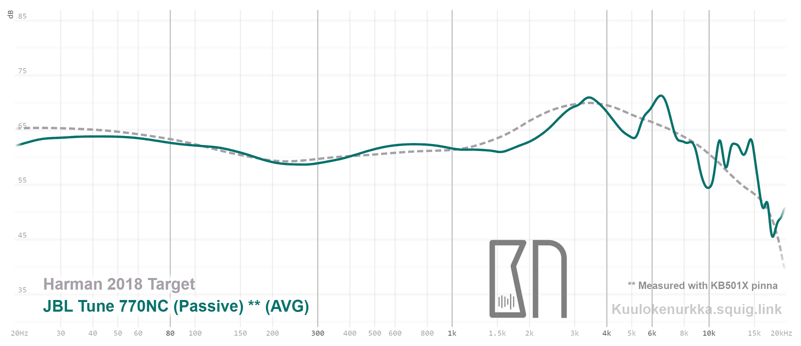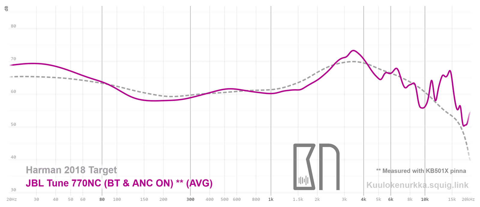 Harmanin tavoitekäyrän vaikutus näkyy selvästi JBL Tune 770NC:n taajuusvasteessa. Kuulokkeet mukailevat läheisesti tätä tavoitetta, eikä tuunauksessa oikeastaan ole suurempia virheitä. Ottaen huomioon, kuinka vaikeaa kuulokkeiden mittaaminen pienten korvapehmusteiden vuoksi on, taajuusvaste myös antaa Tune 770NC:n äänestä hyvän yleiskuvan.