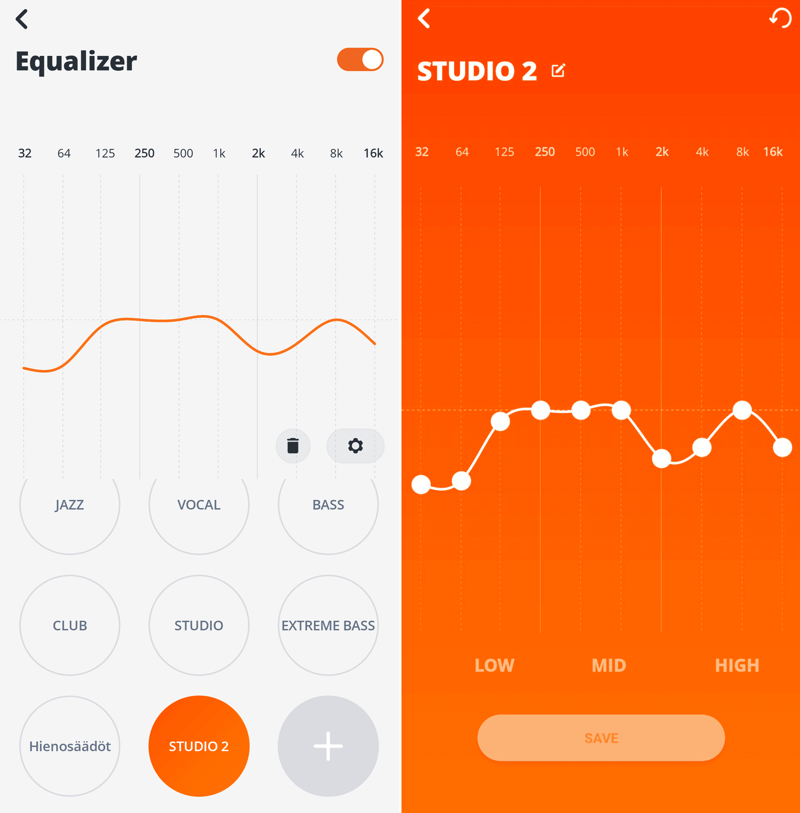 JBL:n taajuuskorjain mahdollistaa äänen säätämisen enintään 6 desibeliä ylös- tai alaspäin. Myös säädettävät taajuusalueet ovat vapaasti valittavissa graafisessa säätöikkunassa, mutta todellisuudessa jyrkkien muutosten tekeminen lähellä toisiaan oleville taajuuksille on lähes mahdotonta, koska lopputulos pyöristyy tallennusvaiheessa asetettua laveammaksi. Tämä ei kuitenkaan haittaa, koska JBL on jo valmiiksi tuunannut kuulokkeensa hyvin. Taajuuskorjain onkin oikein riittävä esimerkiksi basson tai diskantin määrän muuttamiseen. Useimmat myös varmasti kokisivat säätöjen tekemisen ja profiilien tallentamisen helpoksi. Sovelluksen kautta olisi valittavissa myös muutamia valmistajan ennakkoon määrittämiä ääniprofiileita, kuten Vocal ja Extreme Bass. Näistä Studio-asetus on melko toimiva sellaisenaan, mutta muut enemmän tai vähemmän yliampuvia. Harmillisesti valittu asetus ei vaikuttaisi aktivoituvan automaattisesti kuulokkeet käynnistäessä, vaan joudun aina käymään sovelluksessa käynnistämässä taajuuskorjaimen uudelleen.