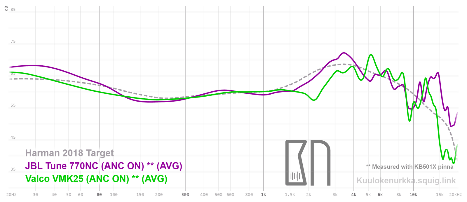 Valcon VMK25 on hyvin eri tyylinen vastamelukuuloke kuin Tune 770NC, koska sen basso ei ole läheskään yhtä voimakasta, vaan kuulokkeiden tuunaus painottaa toiston raikkautta ja yksityiskohtaisuutta hifikuulokkeiden tapaisesti. VMK25:n äänikuva on JBL:n kuulokkeisiin verrattuna tilavampi ja diskantti kirkkaampaa 5–8 kHz:n välillä – Tune 770NC on puolestaan ilmavampi ja säihkyvämpi ylimmän diskanttinsa osalta.
