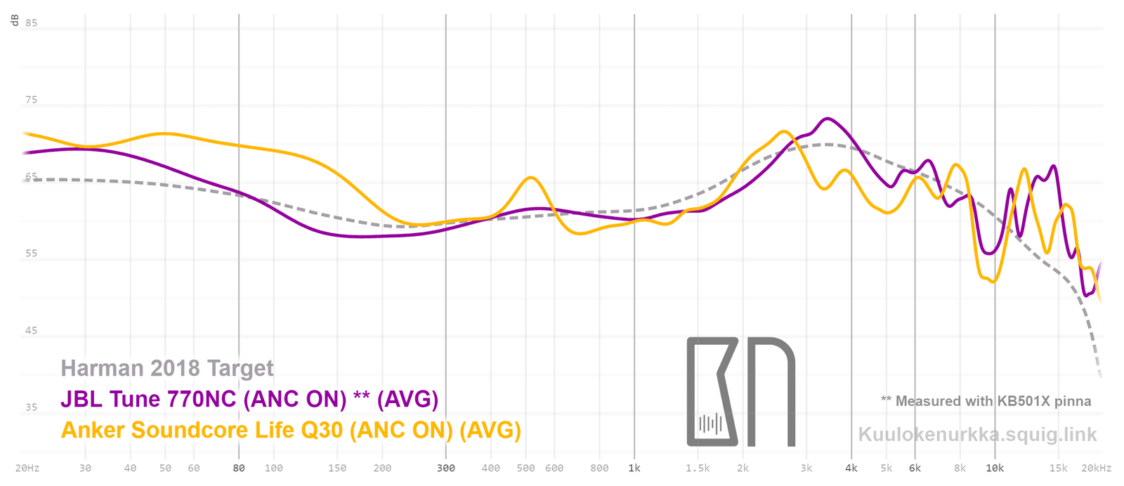 Life Q30:n vahvuudet JBL:n kuulokkeisiin nähden ovat tilavammassa äänikuvassa, joka lienee suurempien korvapehmusteiden ansiota. Rennosti toistuva 4 kHz:n ympäristö tekee myös äänestä miellyttävän rauhallista Tune 770NC:n aggressiivisempiin yläkeskitaajuuksiin verrattuna. Pienellä taajuuskorjauksella JBL-mallista saataisiin kuitenkin melko vastaava, jolloin kaksikko on toisiinsa nähden yllättävänkin vertailukelpoinen. Molempia kuulokkeita kuuntelee mielellään, eikä kumpikaan ole missään valtavasti parempi kuin toinen. Tärkeimpänä huomiona näkisin sen, että hyvään lopputulokseen päästään JBL:n kuulokkeilla huomattavasti pienemmällä vaivalla. Hieman tehokkaamman vastamelutoiminnon ja paremman saatavuuden vuoksi suosittelisinkin nykyään ostamaan mieluummin Tune 770NC:n kuin Soundcore Q30:n. JBL:llä on toki valikoimassaan muitakin vastaavan hintaisia vaihtoehtoja, jotka lienevät tuunaukseltaan lähellä testaamaani kuulokemallia.