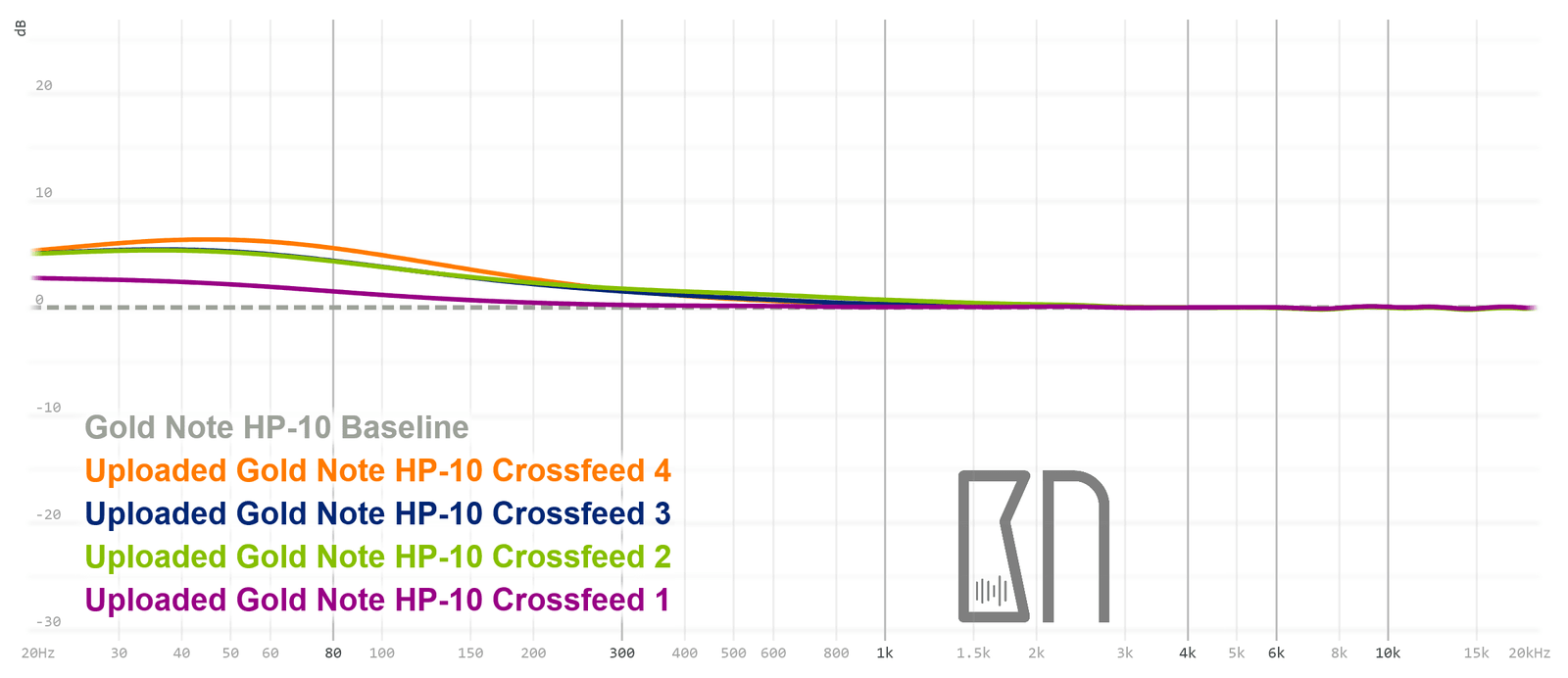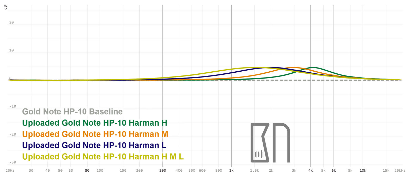 Vahvistin tarjoaa mielenkiintoisesti myös eräänlaisen Harman-EQ:n, joka voimistaa kuulokkeiden niin sanottua ear-gain-aluetta eli sitä kohtaa taajuusvasteesta, jonka tulisi nousta ”raakamittauksissa” ylöspäin vaakasuoran janan sijaan. Tämä perustuu siihen, että ihmisen korvan anatomia voimistaa luontaisesti yläkeskitaajuuksia ja alempaa diskanttia, jolloin aivomme odottavat kuulevansa kyseiset taajuudet kuulokkeiden kautta siten. Joissakin kuulokemalleissa taajuusvaste jää kuitenkin liian suoraksi ~1–6 kilohertsin välillä, minkä seurauksena useimmat meistä aistivat äänen etäisenä ja epäselvänä. Tällainen tilanne voidaan korjata Gold Noten tarjoamilla Harman-käyrillä.