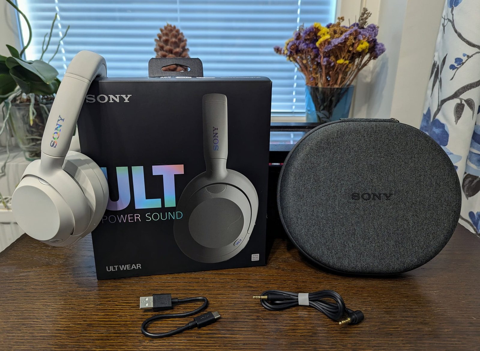 ULT Wear:in pahvilaatikossa suurin huomio keskittyy suurella fontilla kirjoitettuihin mainintoihin ”ULT Power Sound” ja ”Powerful Bass”. Lieneekin välittömästi selvää, millaiselle kohderyhmälle tuote on suunnattu. Mukana tuleva kuljetuskotelo on Sonylle tyypillinen, sillä ULT Wear taittuu kasaan pieneen tilaan samaan tapaan kuin WH-1000XM4 ja sen edeltäjät. Kangaspäällystetty kotelo onkin näppärän kokoinen ja se tuntuu myös kangaspintansa ansiosta mukavalta. Sisältä löytyy kuulokkeiden lisäksi 3,5 millimetrin kuulokekaapeli sekä lähes käyttökelvottoman lyhyt USB-latauskaapeli, jonka voisi melkeinpä jättää kokonaan pois paketista.