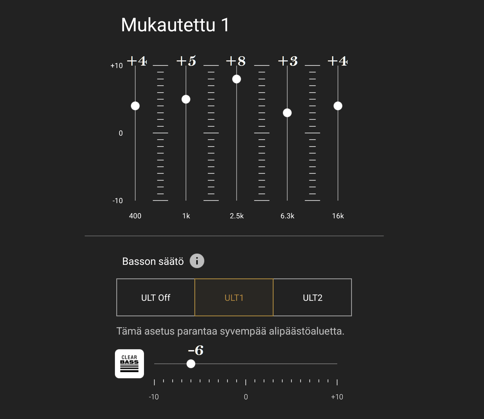 Seuraavat säädöt tuottavat omaan makuuni hyvän lopputuloksen, jonka jälkeen kuulokkeet sopivat kaikenlaiselle musiikille. En koe enää keskibassokorostusta erityisen häiritsevänä, eikä muukaan osa äänestä ole enää vaisua ja tukkoista. Rennosti toistuva 3,5–5 kHz:n väli jää myös yllättävän huomaamattomaksi, vaikka se syökin pois osan äänen raikkaudesta. En muista saaneeni WH-1000XM5:stä yhtä tasapainoisen kuuloista, joten ULT Wear pystyy olemaan taajuuskorjaamisen jälkeen tarvittaessa muutakin kuin pelkkä bassokuuloke. Sitä ei itseasiassa enää edes tunnistaisi samaksi kuulokkeeksi.