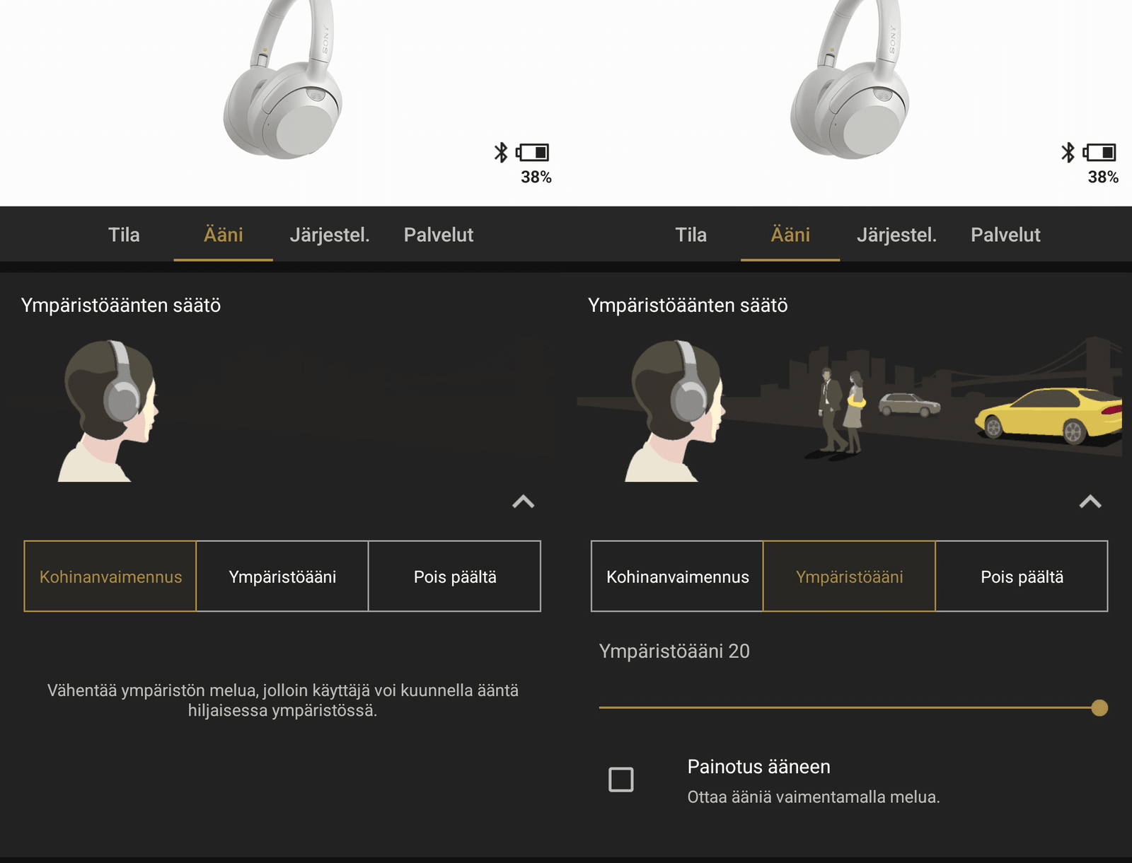 Sony kertoo ULT Wear:in vastamelutoiminnon olevan toteutettu samalla prosessorilla, joka löytyy hintavammasta WH-1000XM-sarjasta. Ympäristömelua mittaavia mikrofoneja ULT Wear:issa on toki selvästi vähemmän, joten prosessori on vain yksi osa kokonaisuudessa. Vastamelutoiminnon tehokkuus tai toimintaperiaate ei ole säädettävissä sovelluksen kautta, mutta läpikuuluvuustila sen sijaan olisi säädettävissä asteikolla 0–20, suurimman asetuksen päästäessä eniten ääntä kuulokkeiden sisään. Läpikuuluvuustila voitaisiin myös määrittää päästämään läpi ihmisen puhe ja vaimentamaan samalla pois esimerkiksi matalataajuuksinen liikennemelu – tämä vie kuitenkin samalla matalat taajuudet ihmisen äänestä. Sonyn kalliimmista kuulokemalleista tuttuun tapaan läpikuuluvuustila voidaan aktivoida hetkellisesti pitämällä kämmentä oikean kupin hipaisupintaa vasten. Pidän siitä, ettei valmistaja ole karsinut lisäominaisuuksia pois vain sen vuoksi, että sen hintavammat kuulokemallit saataisiin näyttämään ULT Wear:ia monipuolisemmilta.
