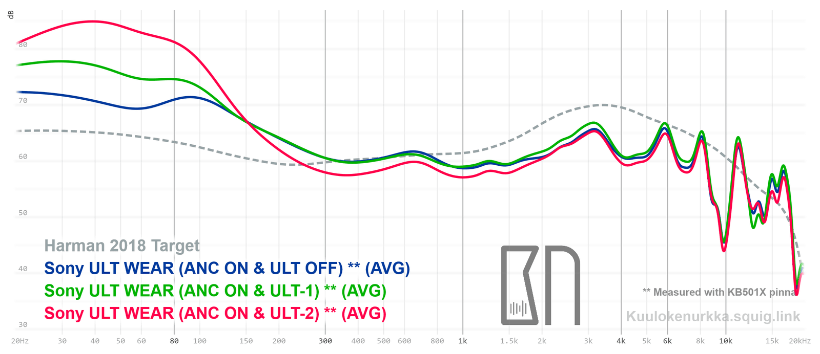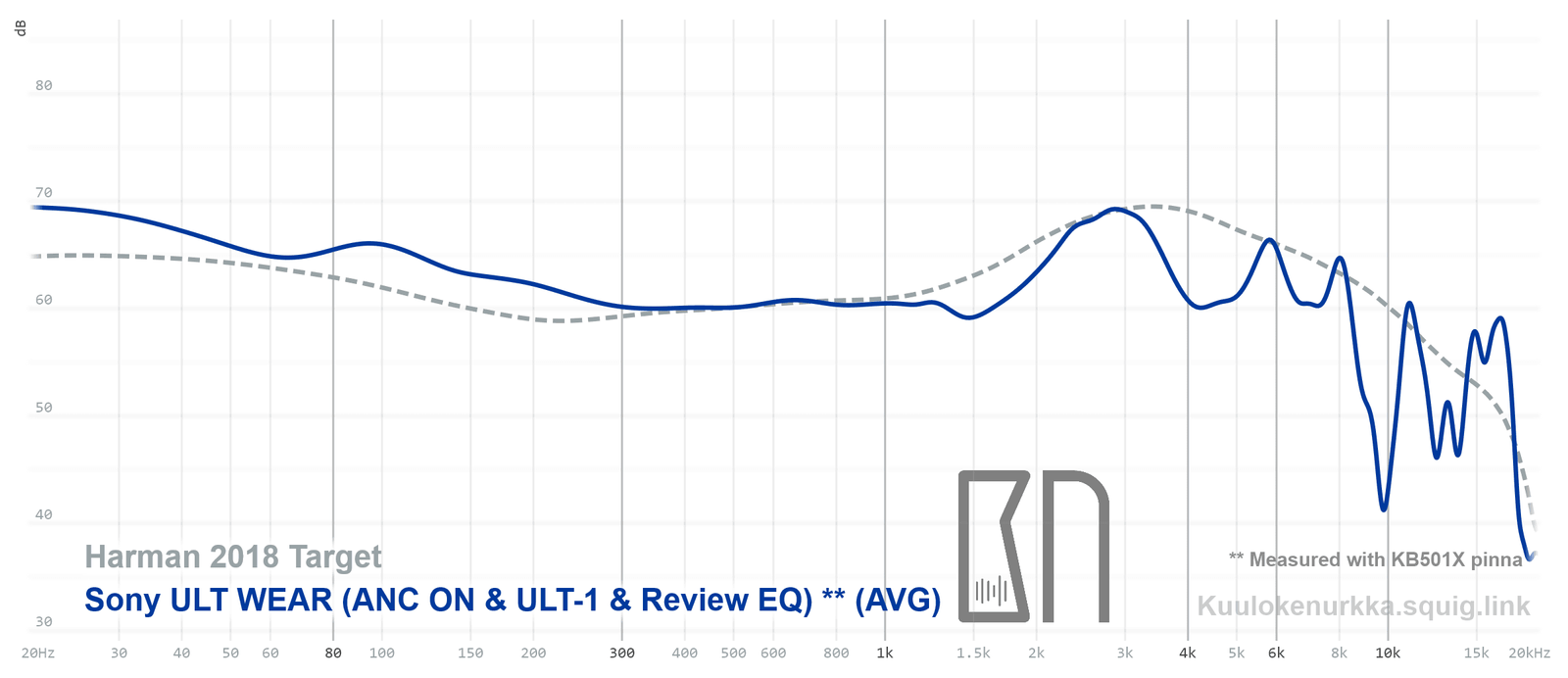 Our frequency response measurements have been made with a clone IEC-60318-4 coupler and KB501X pinnae. The Harman target curve from 2018 is used as a reference point and generalization of the headphone response that would sound good to most people. For more information on the measurements and their accuracy, see Headphone Measurements-sivulta. ULT Wear:in taajuusvaste on myös vertailtavissa muiden mitattujen kuulokkeiden kanssa Squiglink avulla.