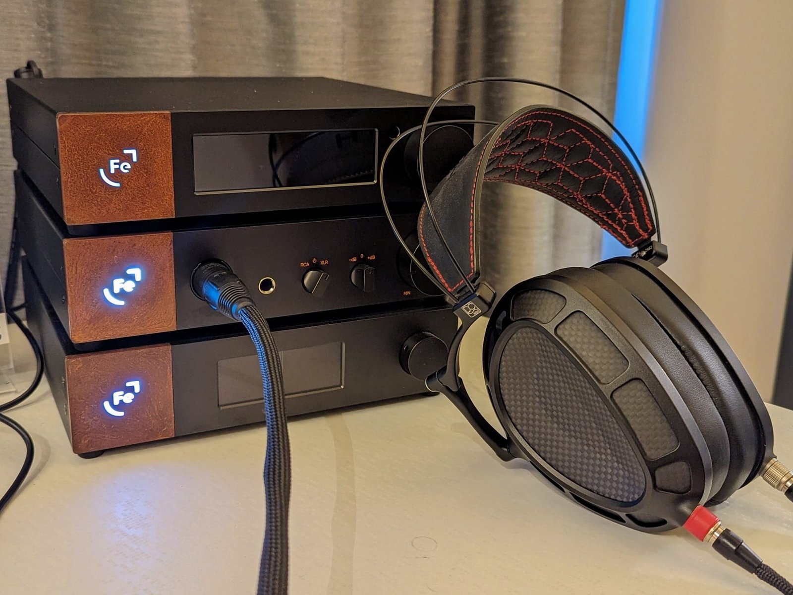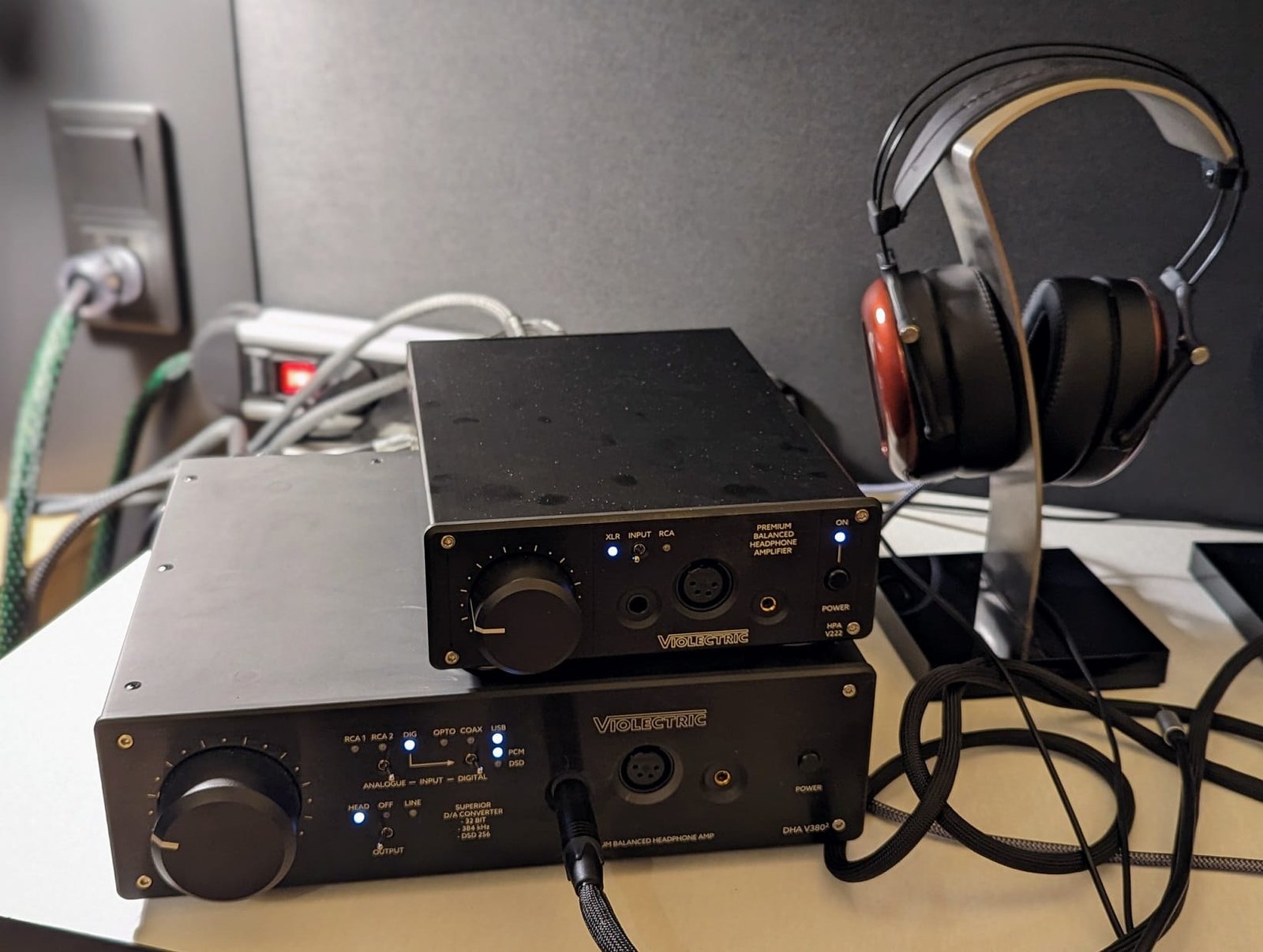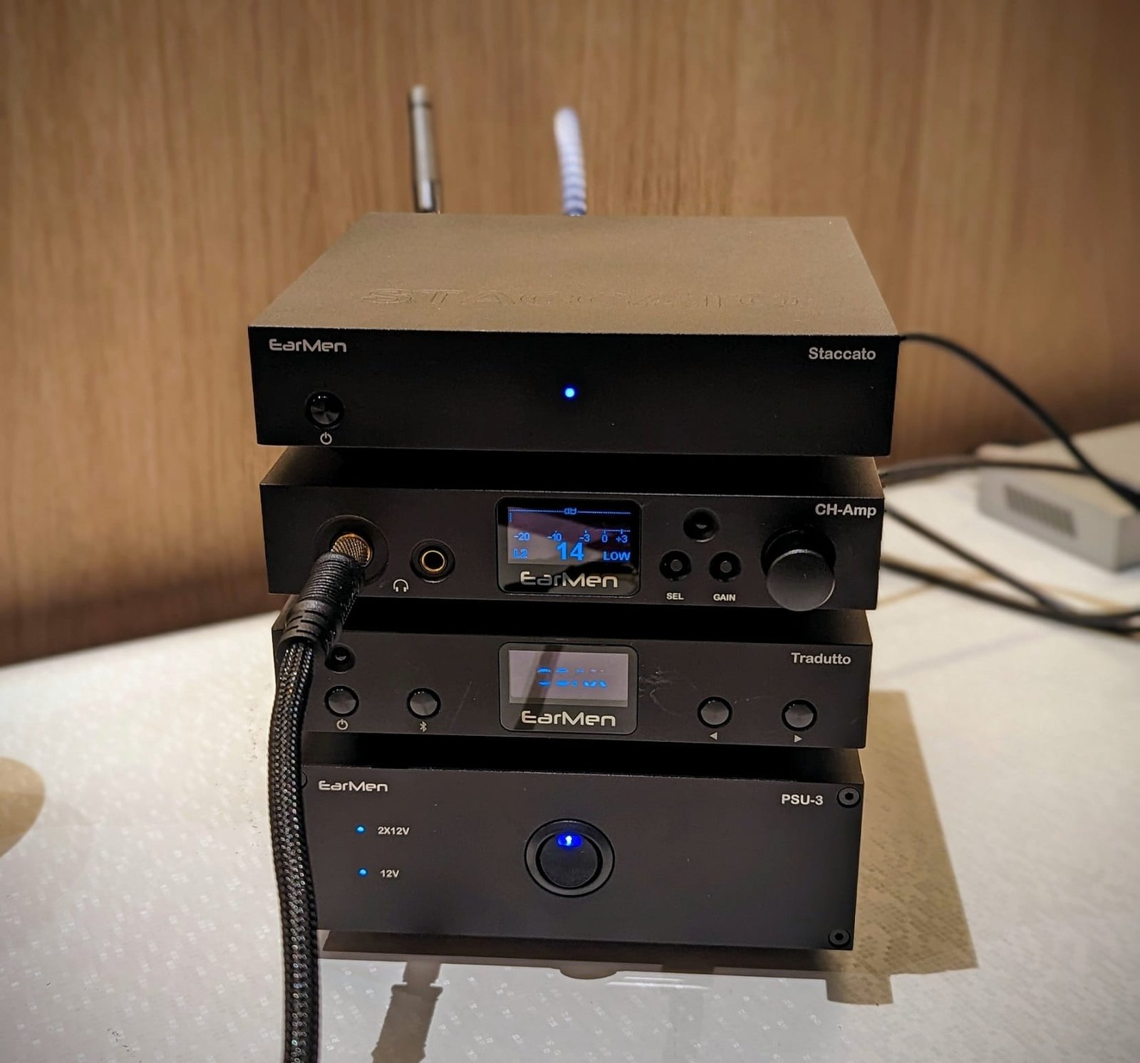 Kruunuradion sviitissä oli puolestaan kokeiltavissa Ferrum Audion ”stäkki” (kokonaishinta noin 6000 euroa), pino EarMen:in pieniä laitteita (kokonaishinta tämän jutun kirjoittamishetkellä alennusten myötä noin 2200 euroa) sekä Violectricin HPA V222 (hinta 1200 euroa) ja järeän kokoinen DHA V380 (hinta 2400 euroa).