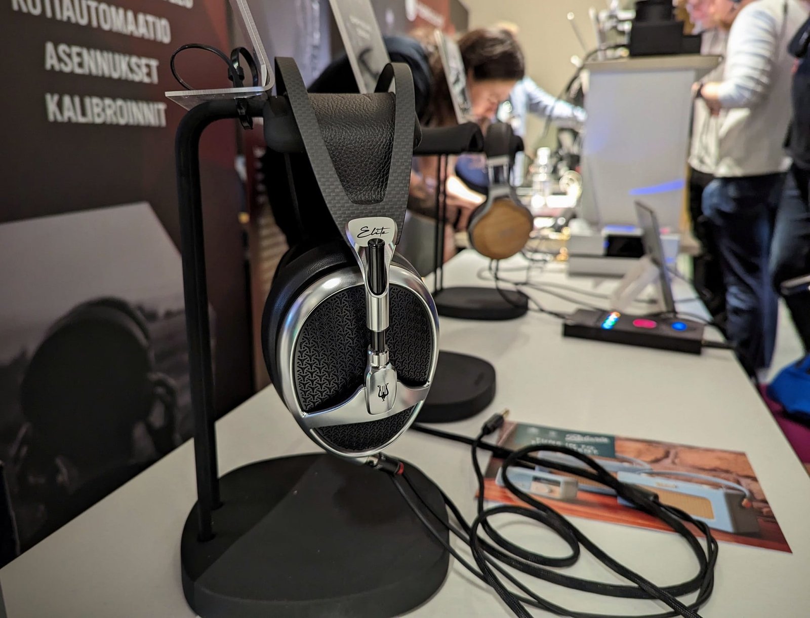 Kaikki tähän mennessä mainitsemani kuulokkeet löytyivät messujen ensimmäisestä kerroksesta, kun taas yhdysvaltalaisen Dan Clark Audion kuulokkeita pääsi kuuntelemaan Kruunuradion sviitissä muutama kerros ylempänä. Olin jo kuullut aiemmin valmistajan edullisemmat kuulokemallit, joten keskityin vertailemaan 4800 euroa maksavia Stealth- ja Expanse-malleja. Näistä Stealth on suljettu kuuloke, kun taas sen jälkeen julkaistu Expanse on kuppirakenteeltaan avoin – ainakin teoriassa. Kupit kyllä näyttävät verkkomateriaalinsa ansiosta avoimilta, mutta elementin takana on silti paksu kerros vaimennusmateriaalia. Expanse tuntui päässä yllättävänkin suljetulta ja vaimensi myös selvästi omaa puheääntäni.