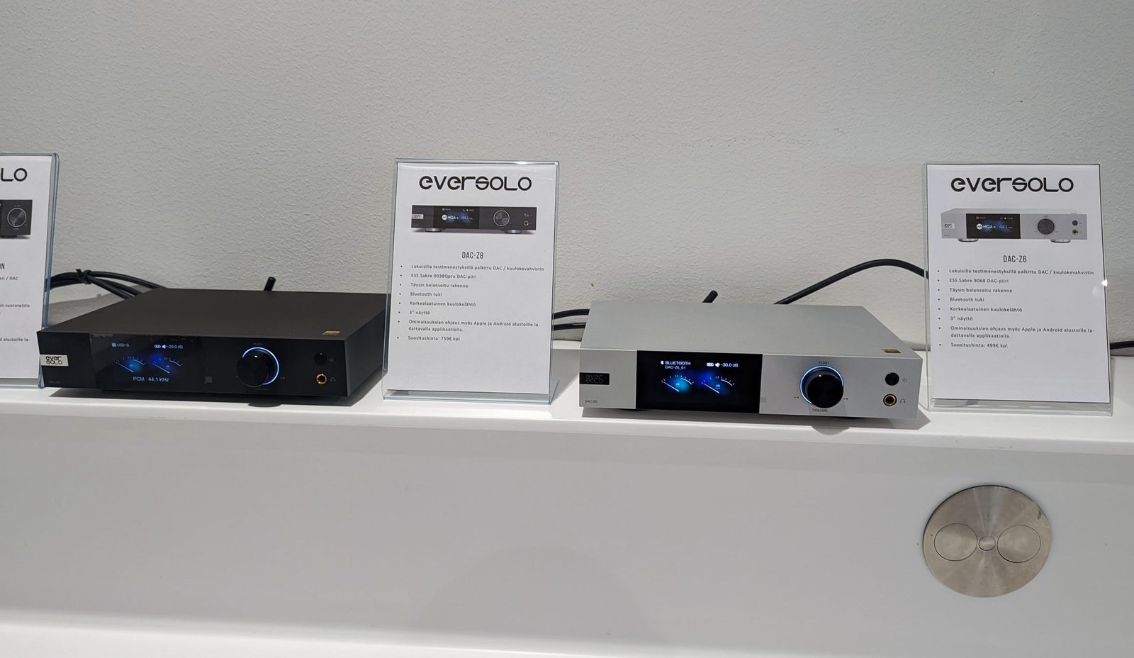 Löysin myös messuilla kävellessäni sattumalta ominaisuuksiltaan mielenkiintoiset Eversolo DAC-Z6:n ja DAC-Z8:n. Molemmat näistä sisältävät balansoidun D/A-muuntimen lisäksi kuulokevahvistimen ja digitaaliset VU-mittarit. Laitteet tukevat myös Bluetooth-yhteyttä ja niitä voidaan ohjata puhelinsovelluksella. Kaikki tämä huomioiden Z6-mallin 500 euron hinta ja Z8:n 760 euron hinta tuntuu erittäin kilpailukykyiseltä. Laitteet ovat myös mielestäni hienon näköisiä.