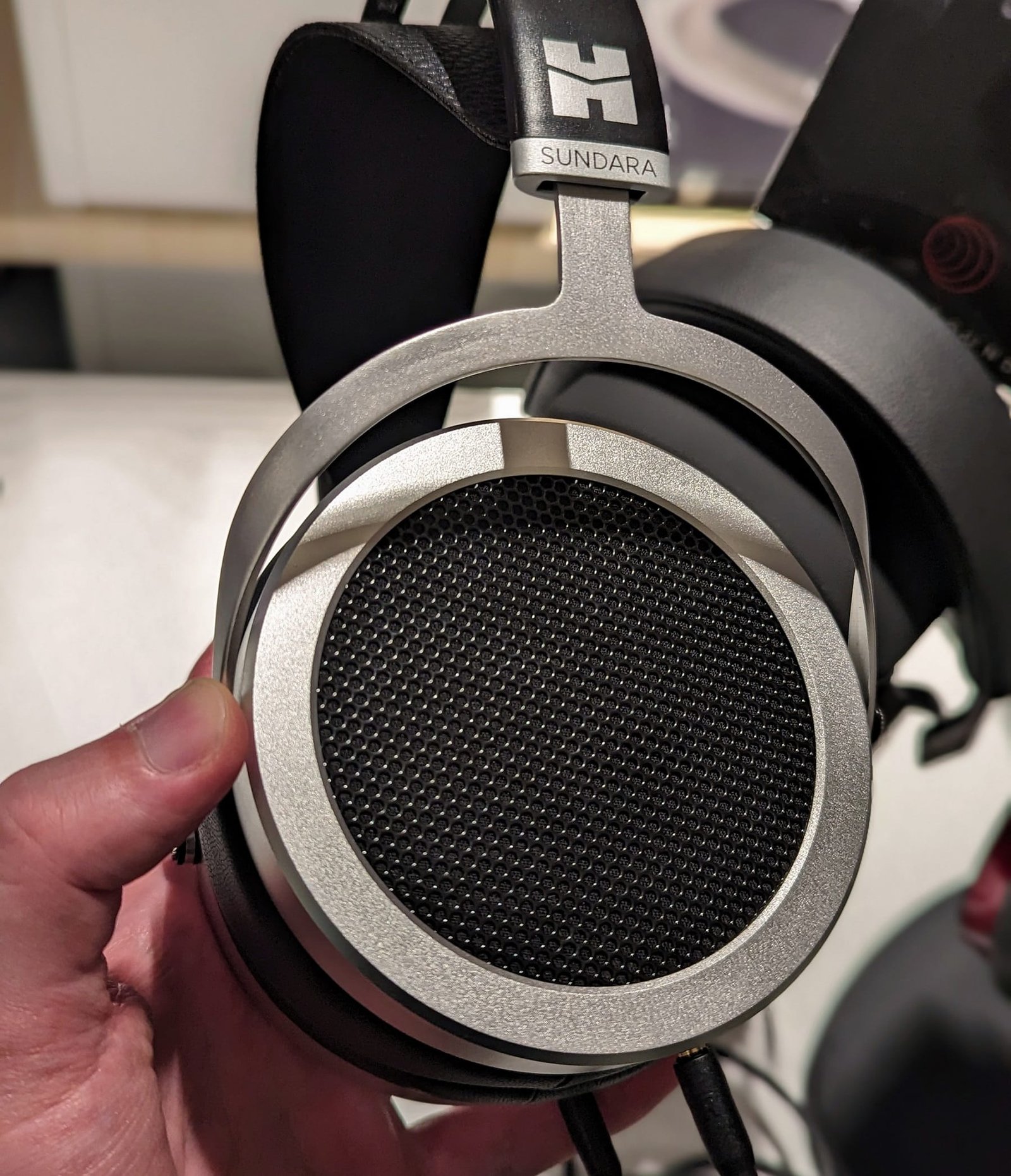 Hifimanilta oli esillä myös kaikessa hiljaisuudessa Euroopan markkinoille julkaistu Sundara Silver (hinta alkuun 450 euroa, mutta tippuu varmasti valmistaja tuntien pian), joka näyttää varsin erilaiselta mustaan edeltäjäänsä verrattuna. Kupit ovat edelleen metallia, mutta ne ovat nyt hopeiset samoin kun sangan haarukatkin. Harvahko metalliritilä puolestaan on vaihdettu suljetumpaan ja sen takana on paksuhkoa vaimennusmateriaalia. Muina muutoksina kuulokkeiden mukana toimitetaan nyt peräti 3 metriä pitkä kaapeli.