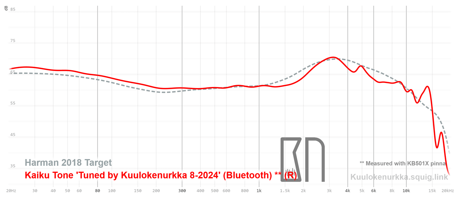 Loppuun haluan vielä mainita, että kuulokeyksilöiden välillä on aina pientä vaihtelua, joten en voi olla varma, kuinka lähelle julkaisemaani taajuusvastetta kukin Kaiku Tone -pari asettuu. Laadunvalvonnasta vastaa Kaiku Acoustics itse. Nyt objektiivisen äänenlaadun pitäisi joka tapauksessa olla siinä määrin kohdallaan, että aika näyttää, mitä kuulokkeista kehkeytyy.