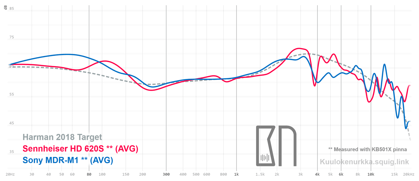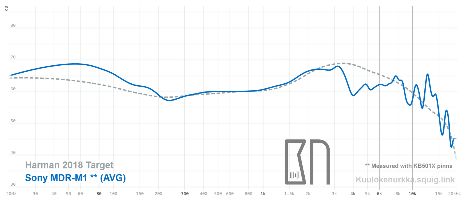 Kuulokkeiden taajuusvastemittaukset on tehty IEC711-standardin mukaisella laitteistolla ja KB501X-mallisilla silikonikorvilla. Kuvaajissa käytetään vertailupohjana tieteelliseen tutkimukseen pohjautuvaa Harmanin tavoitekäyrää (vuoden 2018 versio), joka on yleistys siitä, millaisen taajuusvasteen mukainen ääni kuulostaisi suurimman osan mielestä hyvältä ja vastaisi tasapainoisia kaiuttimia hyvin akustoidussa huoneessa. Lisätietoa mittauksista ja niiden tarkkuudesta löytyy Taajuusvastemittaukset-sivulta. MDR-M1:n taajuusvaste on myös vertailtavissa muiden mitattujen kuulokkeiden kanssa Squiglink-vertailutyökalun avulla.