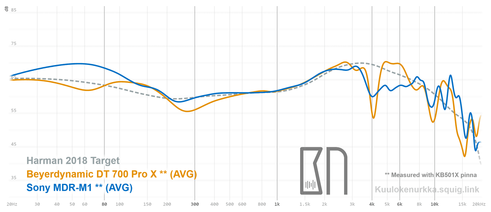 Taajuusvasteita vertaillessa voidaan nähdä, että DT 700 Pro X:stä puuttuu melko suuri pala 300 hertsin ympäriltä, minkä lisäksi diskantti on korostunutta 4,5–6,5 kilohertsin välillä. Nämä piirteet sekä 4 kilohertsin kohdalle asettuva syvä kuoppa (vaiheen kumoutuma) ohjaavat huomiota kohti diskantin terävyyttä ja yläbasson jytinää. Toisaalta vokalisti asettuu MDR-M1:n tapaan lähelle äänikuvassa, mikä on yksi kuulokkeita yhdistävä piirre. DT 700 Pro X:n värittyneisyyden vuoksi koen sen kuitenkin epäselvemmän ja ontomman kuuloiseksi, kun taas MDR-M1:n toisto on rentoudestaan huolimatta luonnollisempaa. Osittain DT 700 Pro X:n lievää epäselvyyttä saattaa voimistaa myös elementin päälle asetettu paksu kangaskerros, jonka tehtävänä on vaimentaa korostuvaa diskanttia.