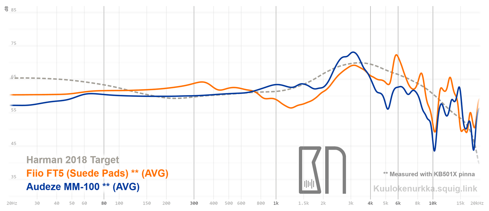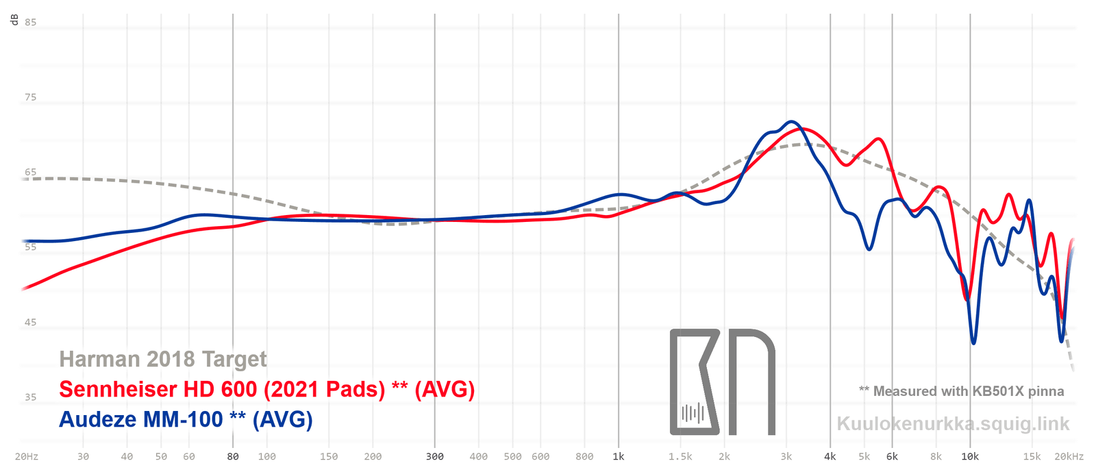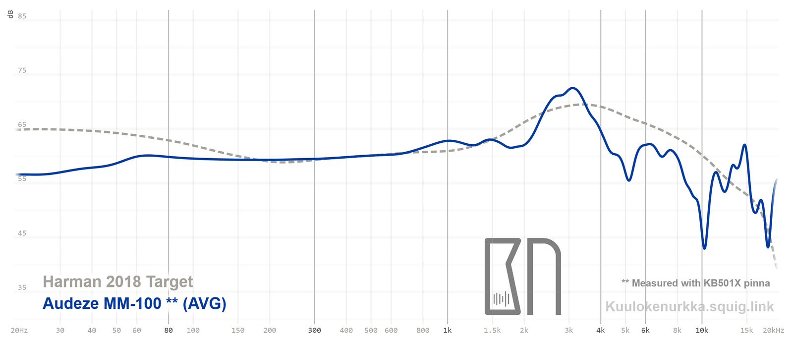 Kuulokkeiden taajuusvastemittaukset on tehty IEC711-standardin mukaisella laitteistolla ja KB501X-mallisilla silikonikorvilla. Kuvaajissa käytetään vertailupohjana tieteelliseen tutkimukseen pohjautuvaa Harmanin tavoitekäyrää (vuoden 2018 versio), joka on yleistys siitä, millaisen taajuusvasteen mukainen ääni kuulostaisi suurimman osan mielestä hyvältä ja vastaisi tasapainoisia kaiuttimia hyvin akustoidussa huoneessa. Lisätietoa mittauksista ja niiden tarkkuudesta löytyy Taajuusvastemittaukset-sivulta. MM-100:n taajuusvaste on myös vertailtavissa muiden mitattujen kuulokkeiden kanssa Squiglink-vertailutyökalun avulla.