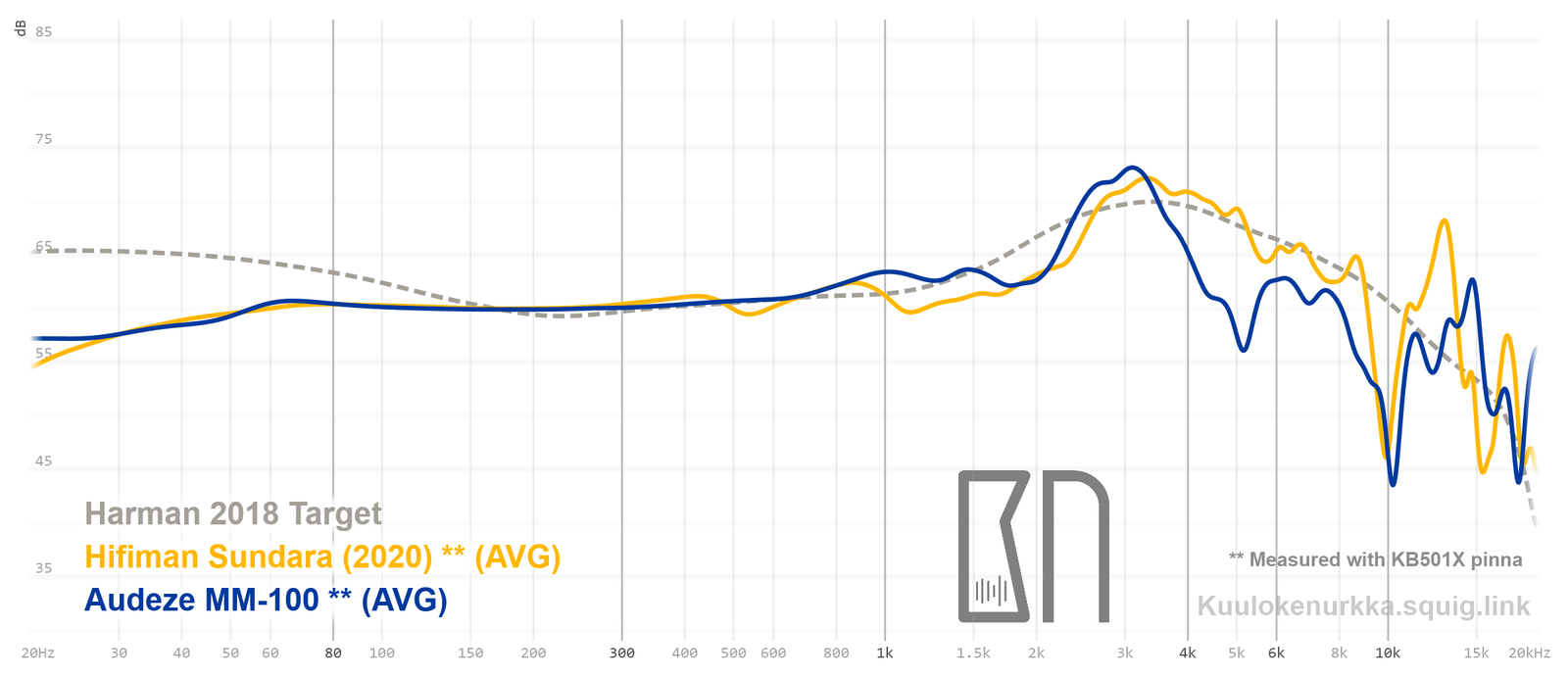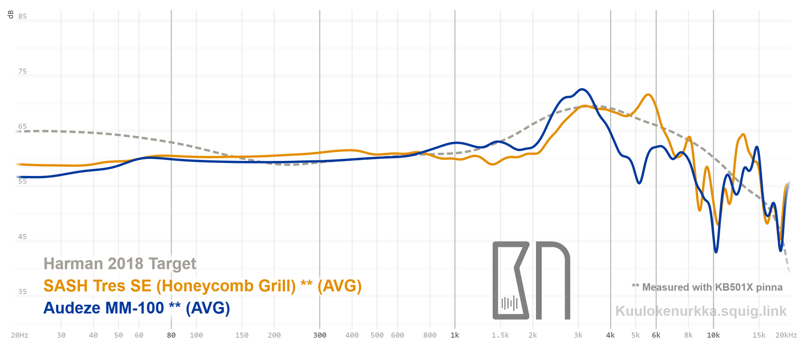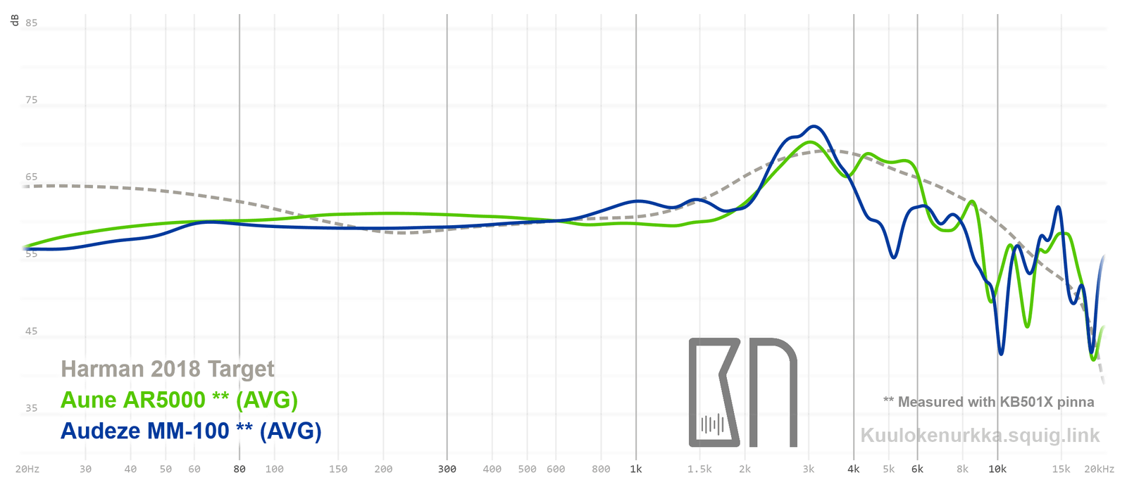 Kuulokkeiden taajuusvastemittaukset on tehty IEC711-standardin mukaisella laitteistolla ja KB501X-mallisilla silikonikorvilla. Kuvaajissa käytetään vertailupohjana tieteelliseen tutkimukseen pohjautuvaa Harmanin tavoitekäyrää (vuoden 2018 versio), joka on yleistys siitä, millaisen taajuusvasteen mukainen ääni kuulostaisi suurimman osan mielestä hyvältä ja vastaisi tasapainoisia kaiuttimia hyvin akustoidussa huoneessa. Lisätietoa mittauksista ja niiden tarkkuudesta löytyy Taajuusvastemittaukset-sivulta. MM-100:n taajuusvaste on myös vertailtavissa muiden mitattujen kuulokkeiden kanssa Squiglink-vertailutyökalun avulla.