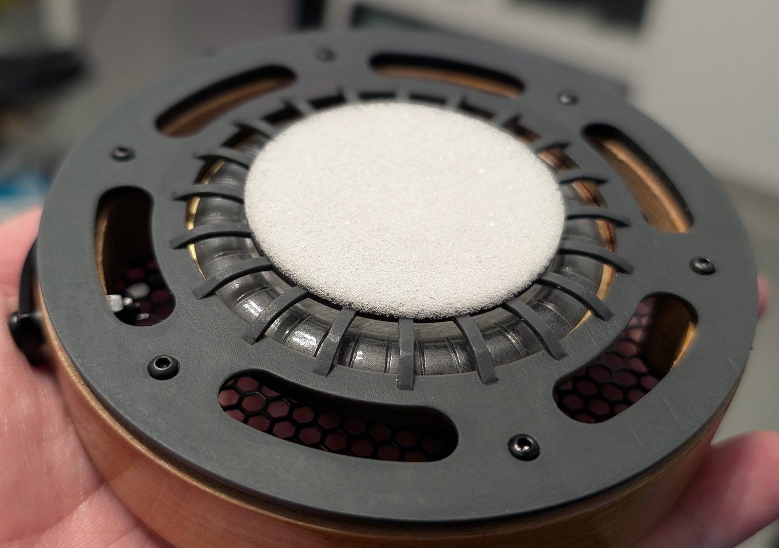 Itse elementtikin paljastuu mielenkiintoiseksi, koska vain kalvon keskiosa on bioselluloosaa ja harmaa reunaosa jotakin muuta materiaalia. Keskelle on asetettu ohut vaahtokiekko, joka vaimentaa oletettavasti jokin verran diskanttia. Vastaavia elementtejä löytyy esimerkiksi Aliexpressin valikoimasta 300 ohmin impedanssilla toteutettuna, mutten ole löytänyt sellaisia, joissa olisi yhtä aikaa kyseinen kalvo ja magneettirakenne. XK-Audio tuntee varmasti paikallisen valikoiman itseäni paremmin tai se on tilannut elementit omien toiveidensa mukaisesti kustomoituna.