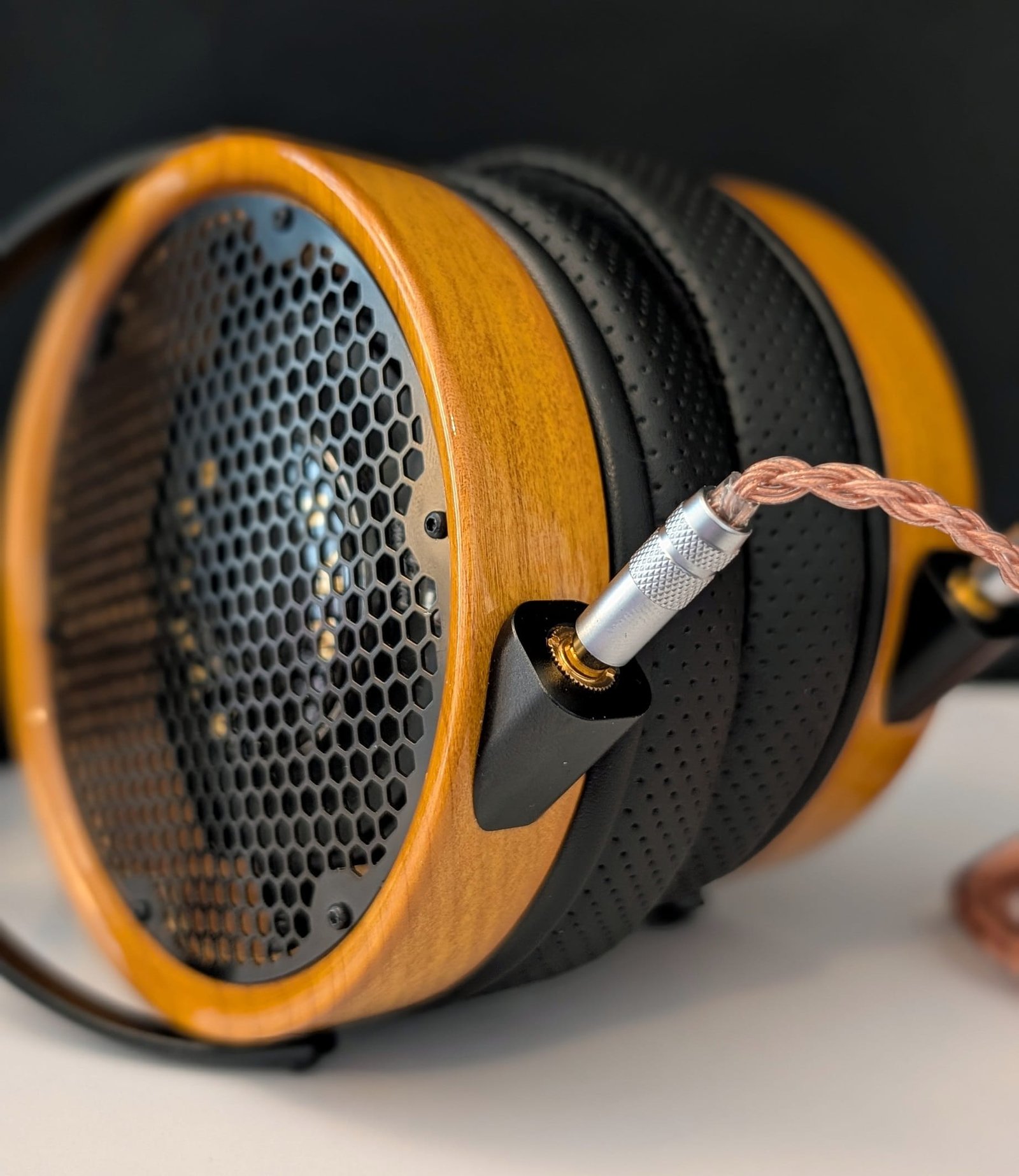 Ohuista johtimista punottu kuparikaapeli lienee suoraan jonkin kiinalaisen valmistajan valikoimasta, sillä olen mielestäni nähnyt vastaavia esimerkiksi Aliexpressiä selatessani. Tämä ei kuitenkaan haittaa, koska XK-Audion toimittama 1,65 metrinen kaapeli on erinomaisen notkea ja käytännöllinen – en pistäisi pahakseni, vaikka tällainen kaapeli tulisi kaikkien kuulokkeiden mukana. Vahvistimeen kiinnittyvä liitin on valittavissa ostovaiheessa, kun taas kuulokkeisiin kaapeli kiinnittyy kahdella 3,5 millimetrin liittimellä kuppien takaosaan. Pidän liittimien sijainnista, koska sen ansiosta kaapeli ei hankaudu käytön aikana hartioita vasten.