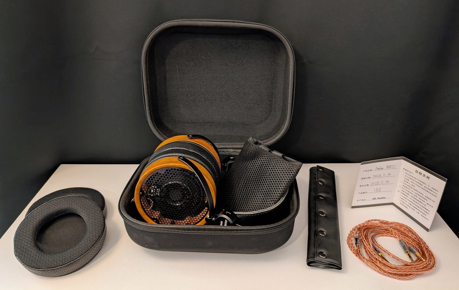Avalon mk2 saapuu suurehkossa kuljetuskotelossa kaapelin ja toisten hieman erilaisten korvapehmusteiden kera. Valmistaja on myös kirjannut pienelle pahvikortille kuulokkeiden valmistuspäivämäärän. Yllä olevassa kuvassa näkyvä pääpannan lisäpehmuste on oletuksena kiinnitettynä kuulokkeisiin.