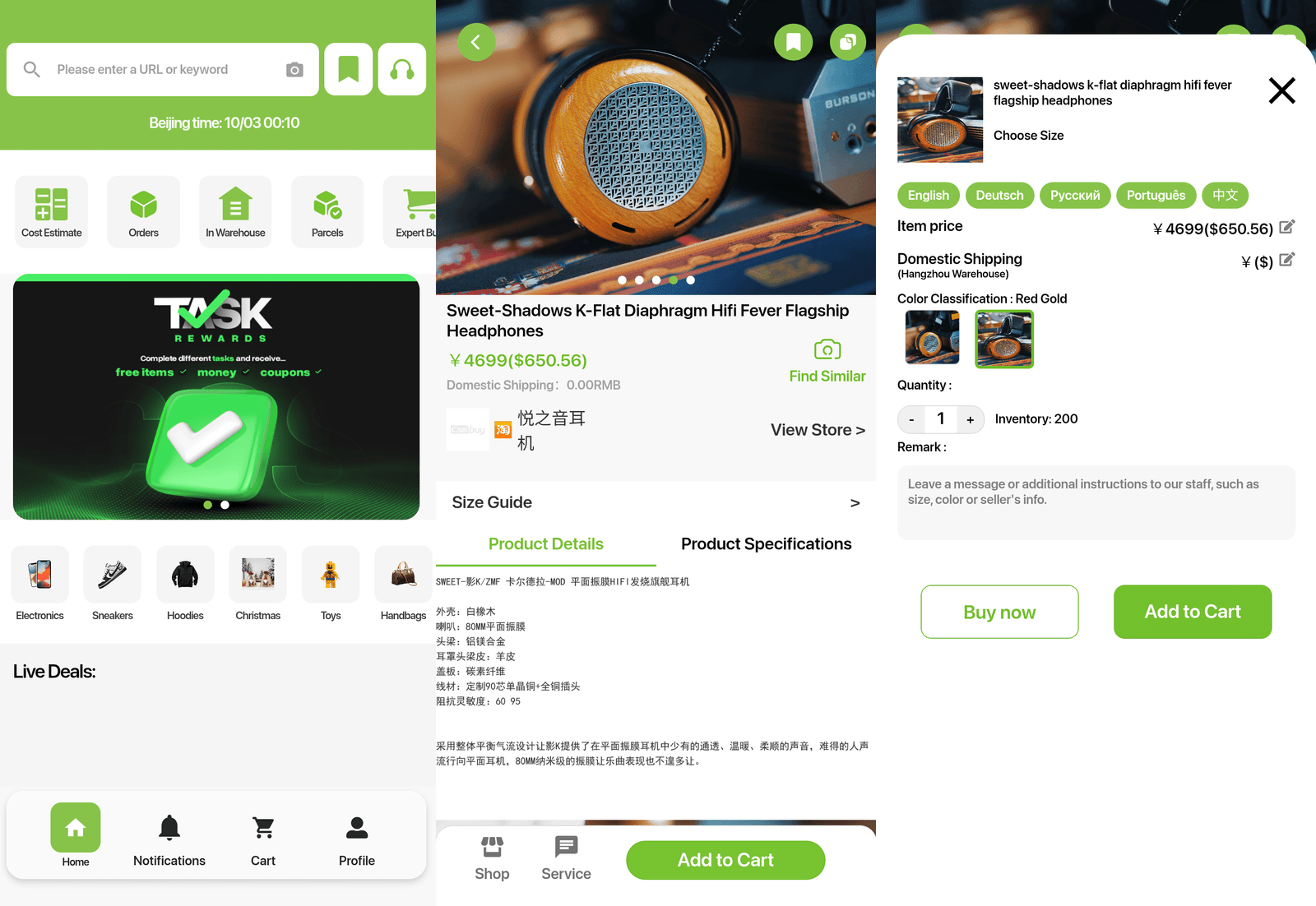 - Tämän jälkeen perehdyin agenttifirmoihin, jotka toimittaisivat tilaukseni Suomeen. CSSBuy:lla on oma englanninkielinen puhelinsovellus, johon täytyi tehdä käyttäjätunnus tai hyödyntää tässäkin tapauksessa Google-tiliä. Sovelluksella on mahdollista tehdä tuotehakuja suoraan Taobao:n valikoimasta, joten etsin sitä kautta uudestaan haluamani kuulokkeet. SuperBuy:n sovellus olisi toiminut tältä osin mielestäni hieman paremmin, koska se osaa löytää Taobao:n tuotesivun suoraan sieltä kopioidun linkin avulla. CSSBuy:n sovellus ei jostakin syystä pystynyt samaan, vaikka sen niin ilmeisesti tulisikin tehdä.