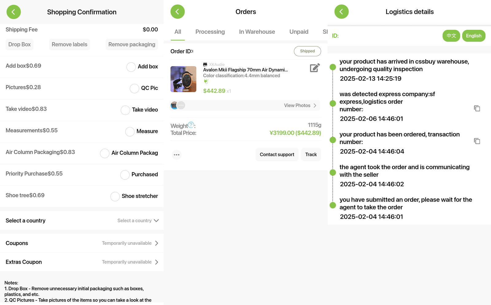 Kun valitsemani kuulokkeet olivat joka tapauksessa löytyneet, niiden tilaaminen oli nyt helpompaa englanninkielisen käyttöliittymän ansiosta. Esimerkiksi ostoskoriin lisätessä eri kaapelivaihtoehdot ja muut lisävalinnat kävivät selkeämmin ilmi kuin Taobao:n puolella. Tilausprosessi itsessään alkoi niin, että kuulokkeet maksettiin joko yhdysvaltain dollareina tai euroina etukäteen CSSBuy:lle, joka teki tilauksen Taobao:sta omalle varastolleen. Postikulut Kiinan sisällä olivat ilmaiset. - Kun kuulokkeet olivat saapuneet noin 1,5 viikon odottelun jälkeen CSSBuy:lle, he valokuvasivat ne erittäin perusteellisesti laadunvarmistusta varten. Toimitusvaihtoehdon valinta jäi itselleni. Minun oli mahdollista valita suoraan kuriiri-/postiyhtiö ja maksaa postikulut tuotteen painon perusteella tehdyn arvion pohjalta tai antaa CSSBuy:n pakata tuote ensin, jolloin lopullisissa postikuluissa huomioitaisiin painon lisäksi myös paketin mitat. Koska molemmissa vaihtoehdoissa täytyi maksaa ensin palvelumaksu, ja koska mahdollinen arvioitujen ja toteutuvien postikulujen hintaerotus olisi joka tapauksessa täytynyt maksaa jälkikäteen, annoin CCSBuy:n pakata kuulokkeet etukäteen.