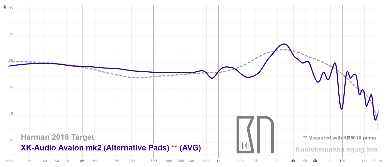 Kuulokkeiden taajuusvastemittaukset on tehty IEC711-standardin mukaisella laitteistolla ja KB501X-mallisilla silikonikorvilla. Kuvaajissa käytetään vertailupohjana tieteelliseen tutkimukseen pohjautuvaa Harmanin tavoitekäyrää (vuoden 2018 versio), joka on yleistys siitä, millaisen taajuusvasteen mukainen ääni kuulostaisi suurimman osan mielestä hyvältä ja vastaisi tasapainoisia kaiuttimia hyvin akustoidussa huoneessa. Lisätietoa mittauksista ja niiden tarkkuudesta löytyy Taajuusvastemittaukset-sivulta. Avalon mk2:n taajuusvaste on myös vertailtavissa muiden mitattujen kuulokkeiden kanssa Squiglink-vertailutyökalun avulla.